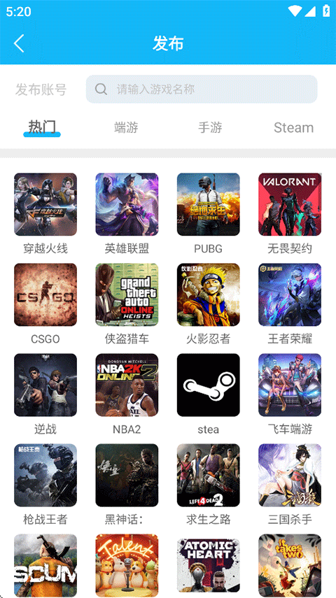 2、选择您需要发布账号的游戏类型;