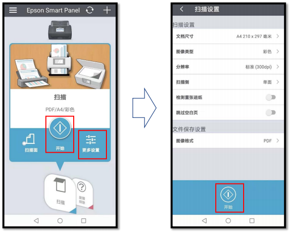 单击如下图所示的”更多设置”,即可对扫描文件进行设置。设置完成后,点击“开始”按钮,即可以