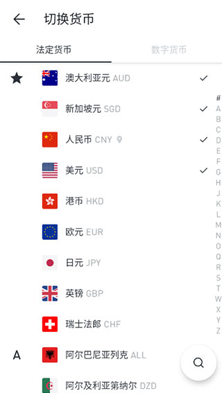2、货币切换:右滑切换 158 种法定货币,也支持数字货币和贵金属查询。