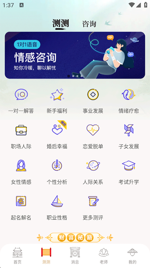 7、在测测功能页系统提供了众多生活情感工具,等你来体验;