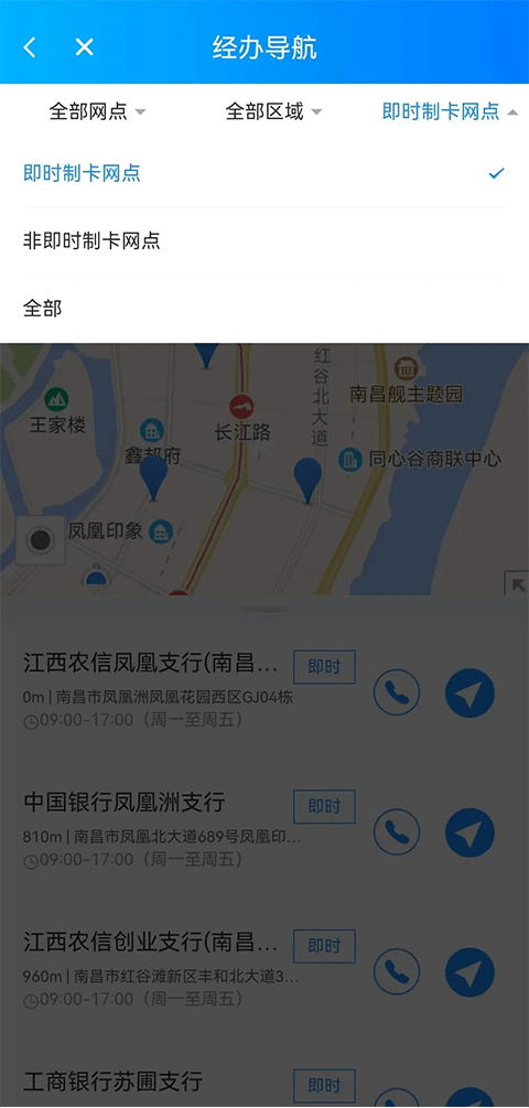 1、办事群众只要打开南昌社保卡App中该模块,它便根据办事群众所在位置自动就近推荐合作金融服务网点,网点地址、咨询电话等信息。