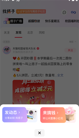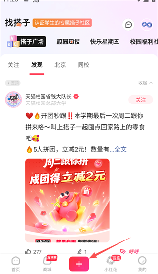 1、进入【找搭子】板块,点击底部中间的红色【+】按钮。