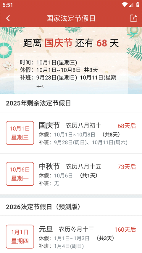 5、节日节气:可以查询传统的二十四节气、传统节日、节假日放假提醒等,同时这些节假日也都会在日历万年历上标记,方便您查看;