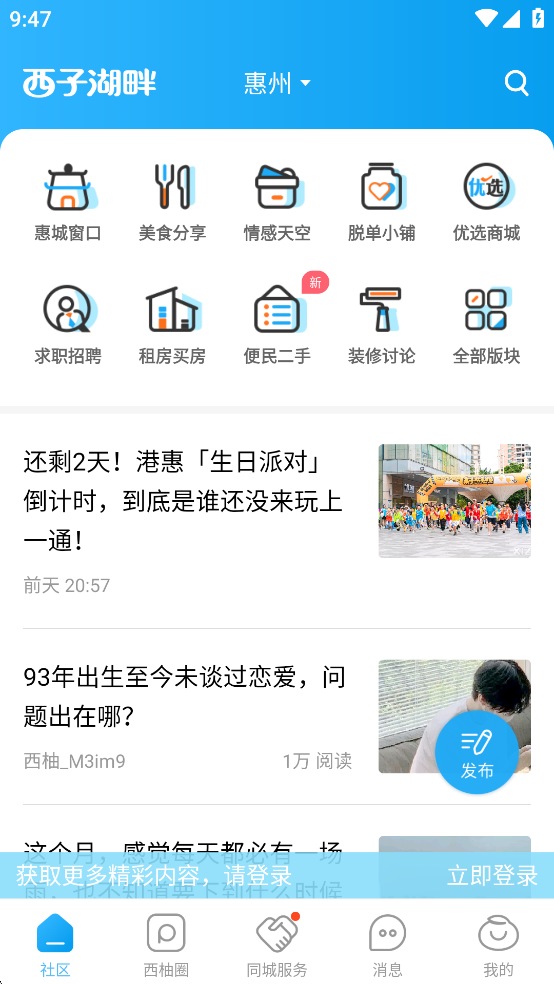 西子湖畔是惠州市本地社区生活服务软件。软件专门为惠州市市民提供最新的城市时事资讯、便民服务、休闲娱乐等服务,为用户提供全面的惠州市吃喝玩乐攻略。软件与众多商家店铺合作,为用户提供海量专属的优惠券,让你的游玩更加实惠。西子湖畔app还是惠州市最大的同城交友平台,你可以在这里轻松找到身边志同道合的朋友,感兴趣的朋友欢迎下载体验!