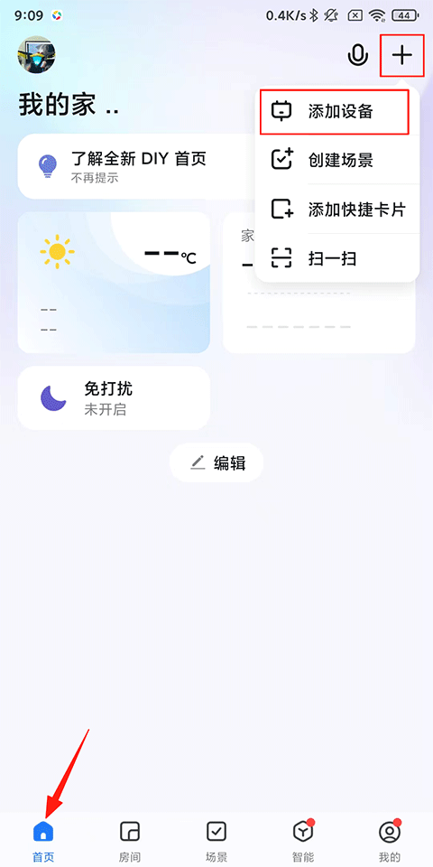 1、打开智能生活APP,点击首页-右上角+按钮-添加设备;
