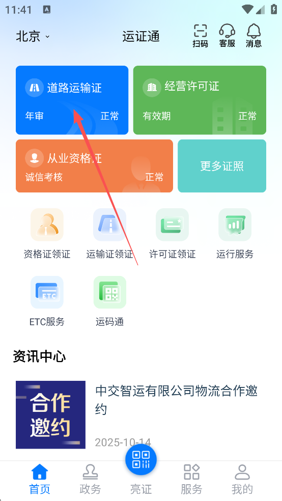 3、以道路运输证照申领为例,首页点击“道路运输证”