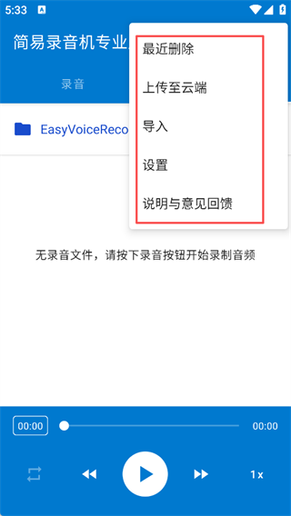 5、点击右上角菜单按钮,可选择【最近删除、上传至云端、导入】等功能,方便管理录音文件。
