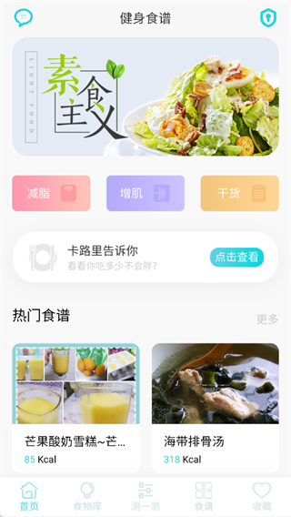 在首页可以快速浏览减脂、增肌、干货等分类内容,还有热门食谱推荐,能帮你找到适合自己的健康饮食方案。