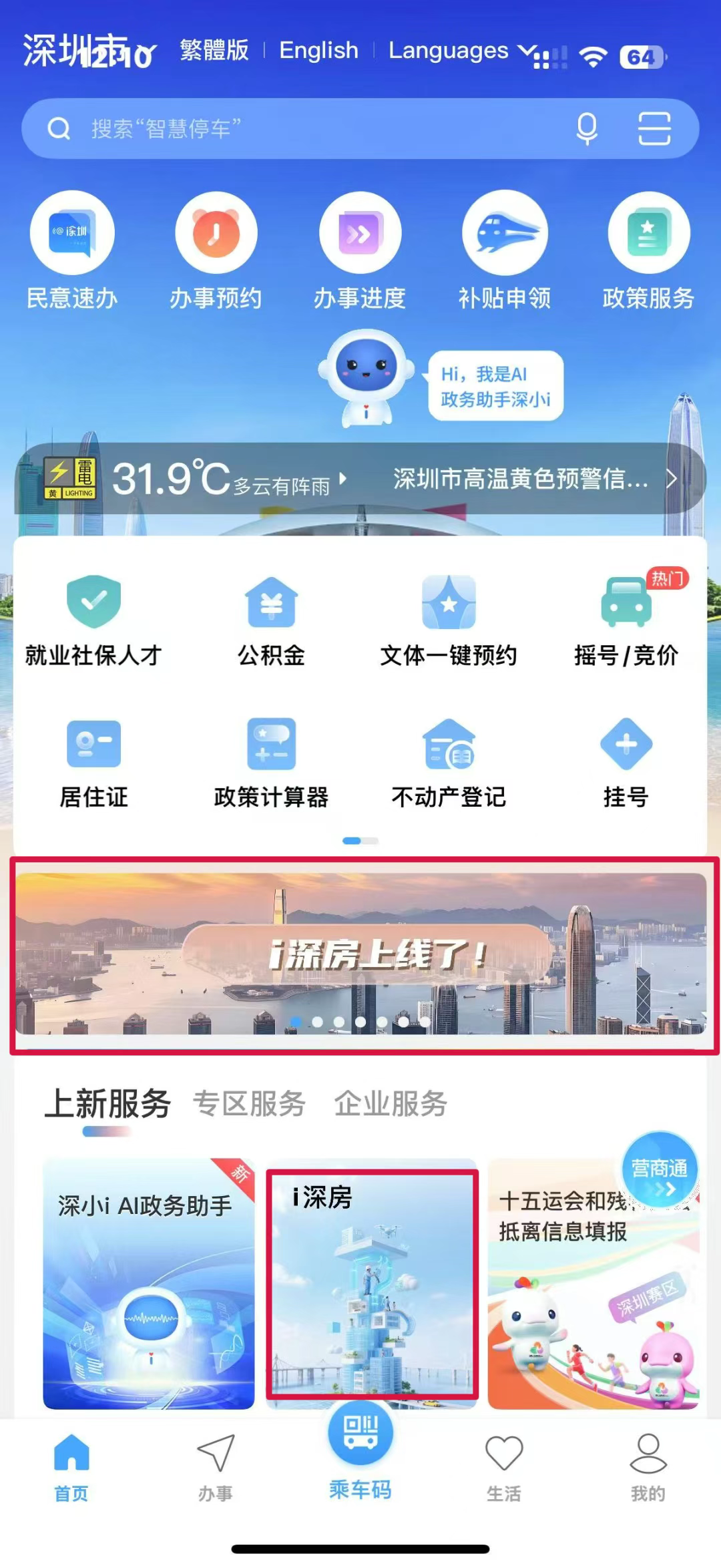 1、打开“i深圳"APP,在首页找到“i深房”,点击即可进入。