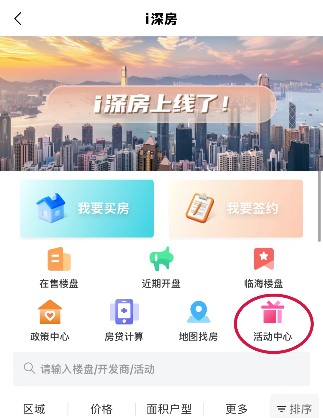8、点击“活动中心”,可第一时间获知深圳市最新推出的房地产优惠活动。