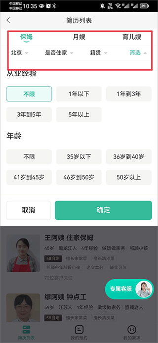 2、进入后在简历列表中选择保姆、月嫂或者育儿嫂,并在下方筛选栏目中选择你的标准