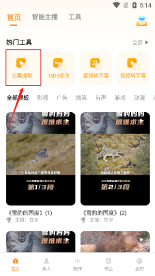 1、首先打开配音鸭app,进入首页,找到“文案提取”