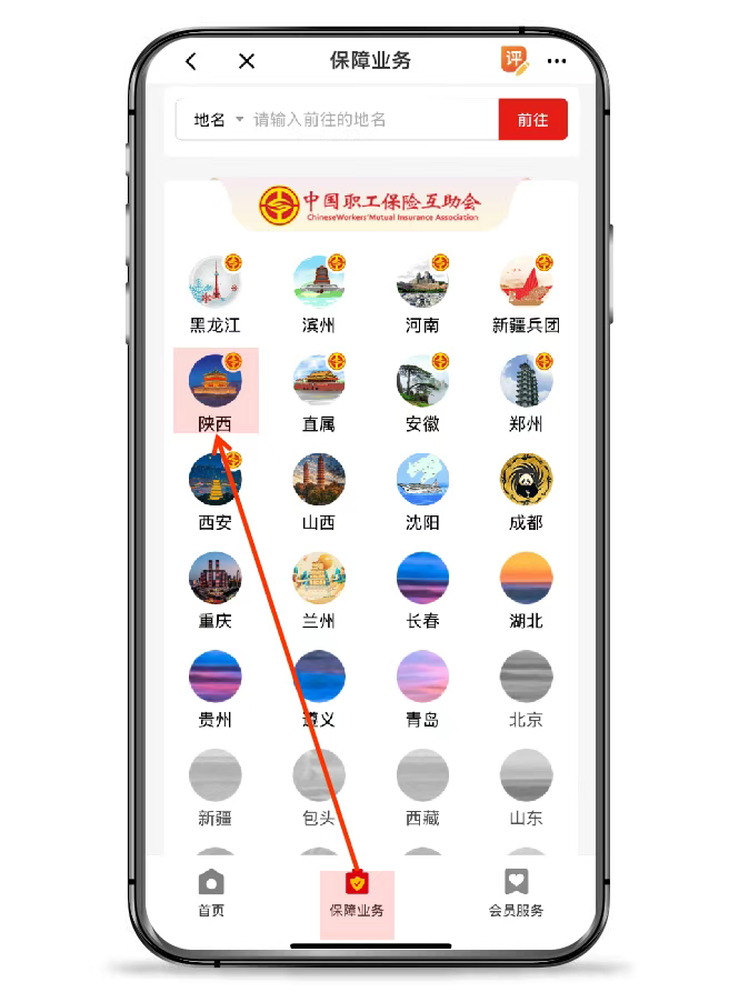 1、登录软件之后,点击首页“职工互助”图标后,点击“陕西“图标;