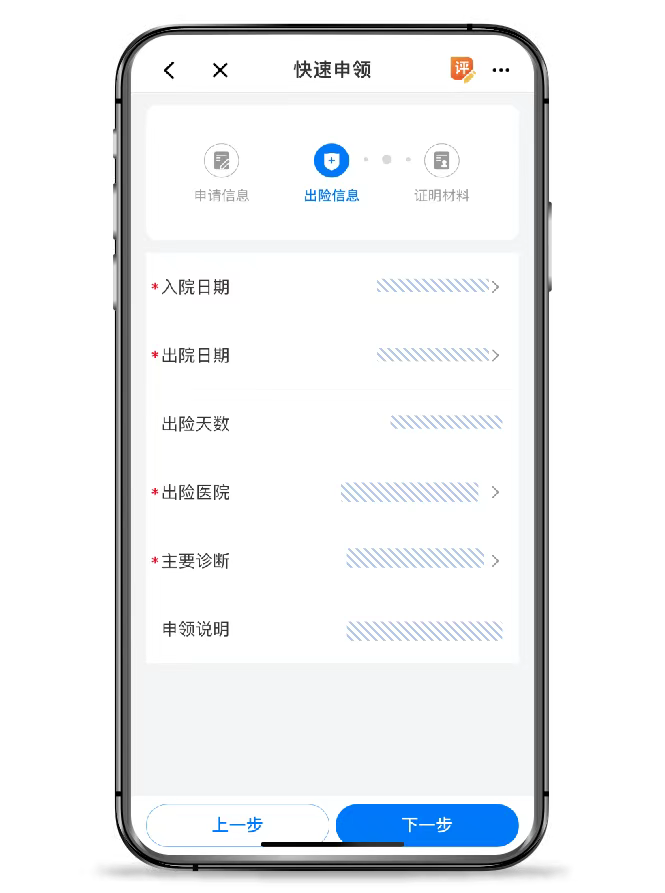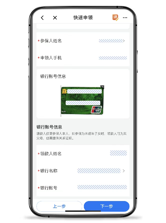4、进入快速申领界面,红色星号为必填项,填写完成后,点击下一步;