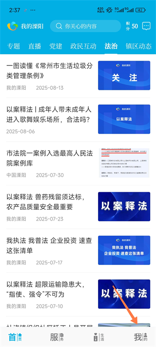 1、打开我的溧阳App,在服务板块找到生活缴费