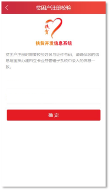 (3)输入注册人本人的姓名与证件号码进行校验,姓名和证件号码与全国扶贫开发系统中录入的信息一致可校验成功。户内每个家庭成员都可以注册。