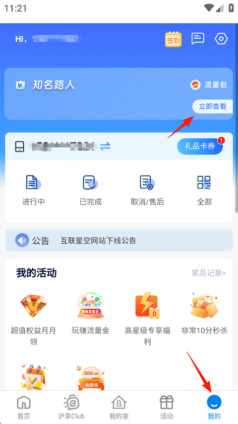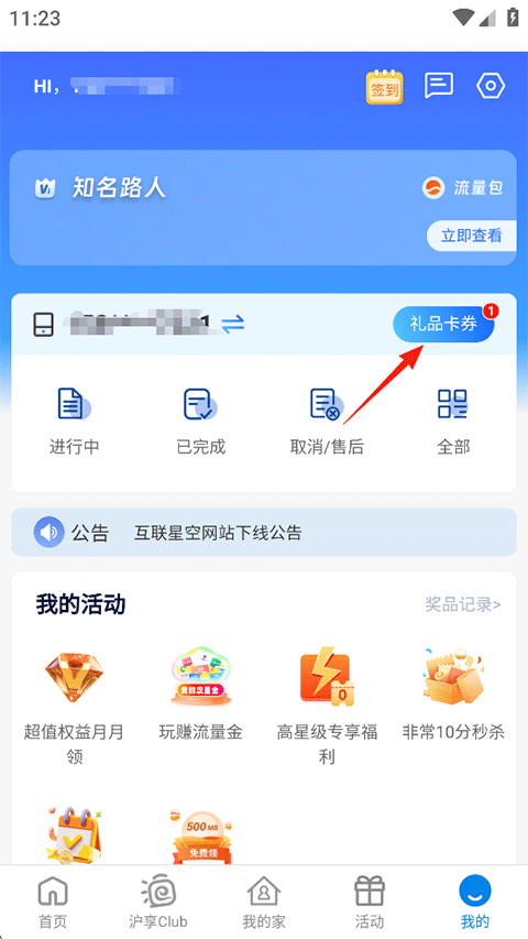 3、领取的流量包和卡券可以在我的-礼品卡券中查看使用;