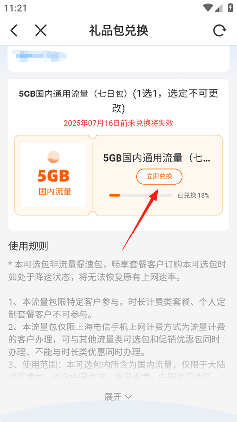 4、在打开的礼品卡券页面中找到刚领取的流量包,点击立即兑换;