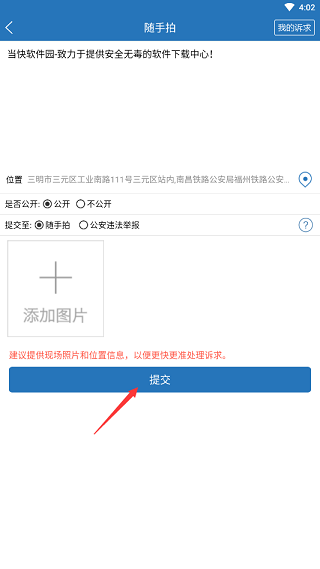 2、完成你的问题描述后获取位置,点击选择是否公开和投诉类型,当然你也可以上传问题图片