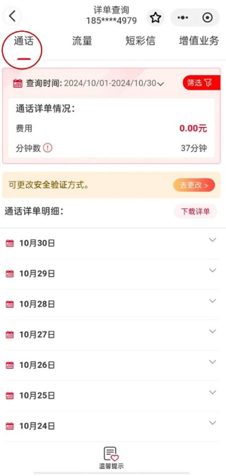 2、在【详单查询】界面里,点击【通话】,按提示验证身份后就可以查询到通话记录了