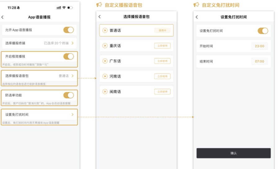 通过App可远程设置云音箱的播报语速、启用极简播报、更换语音包、开启防逃单提醒等功能,即使不在店内也能高效管理收款通知。