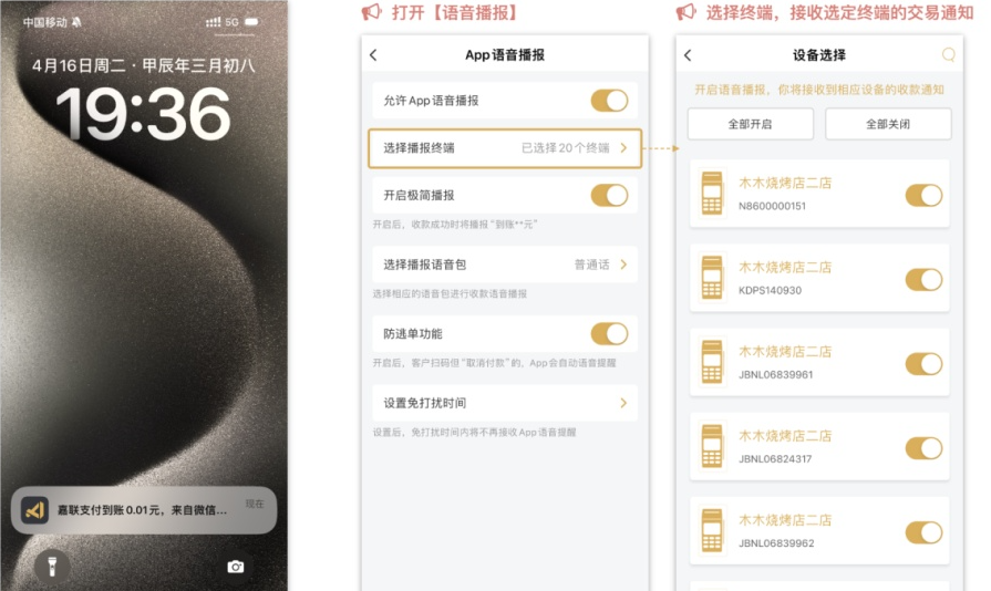 交易到账时,系统将自动语音播报“嘉联支付到账XXX元”,同时在商户手机通知栏推送收款成功提示,确保不错过每一笔收入。