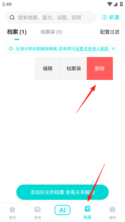 打开准了APP,点击底部导航栏的档案,选择要删除的档案往左滑动,然后点击删除即可。
