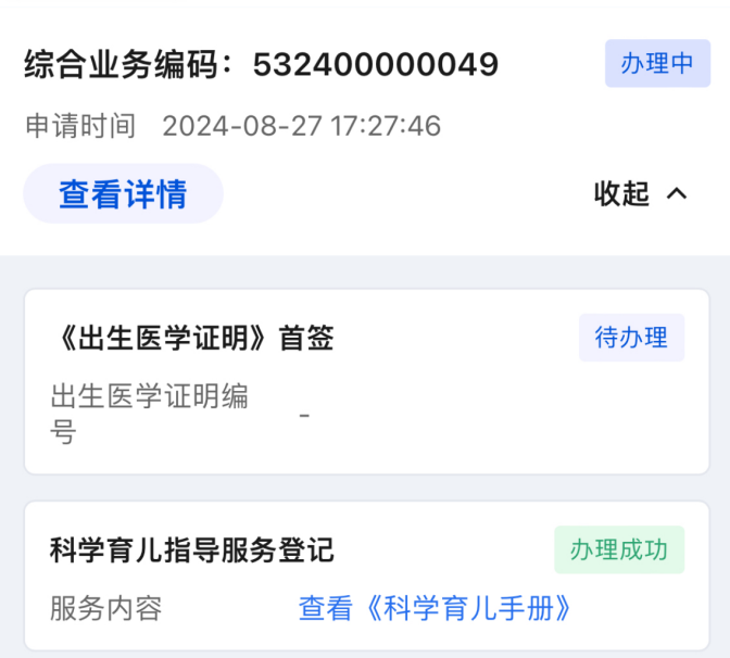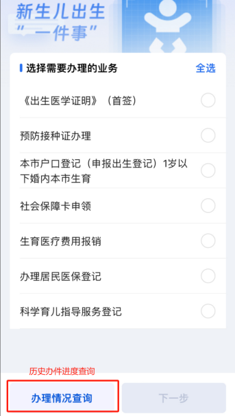 10.再次进入新生儿出生“一件事”在线办理中的联办事项选择界面可查看办理进度。