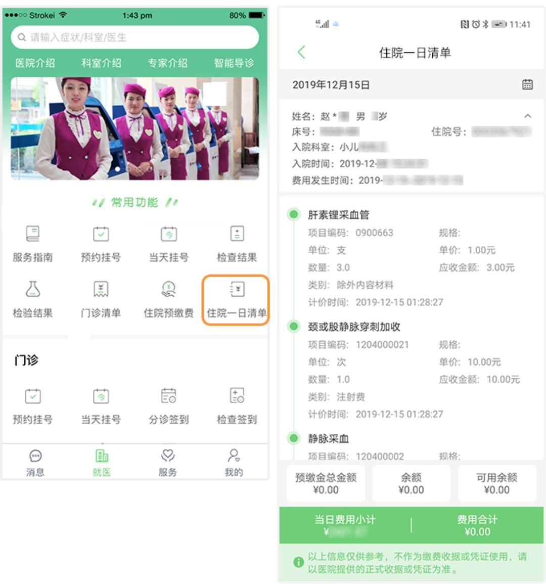 此功能适用于住院患者及出院近三个月的患者,可查看患者住院期间每日的费用清单。