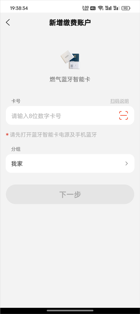 3、输入8位卡号或扫描二维码,点击「下一步」后添加账户成功,并进入充值页面。注意:必须打开手机蓝牙与蓝牙智能卡电源;