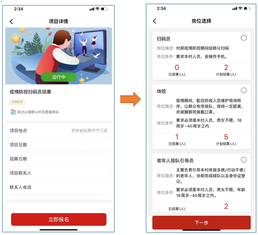 在【首页】中点击【志愿项目】板块,通过筛选条件找到适合自己的志愿活动;进入心仪项目的详情页面后,点击【立即报名】,选择相应岗位并完成报名。需要注意的是,平台只显示对外招募的项目,部分活动可能设有条件限制,需符合条件才能成功参与。