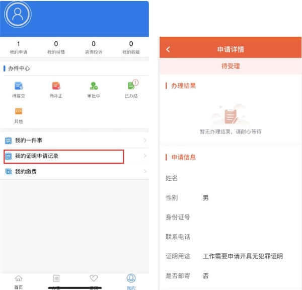 6.申请提交后会收到申请成功的短信,然后进入“我的-我的申请”记录页面查看证明申请进度
