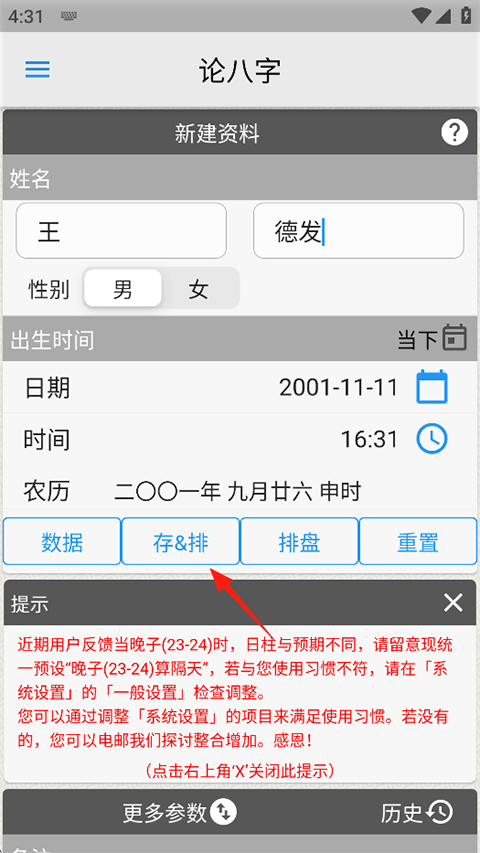 4、返回到首页,输入您要测试的姓名,性别及出生日期,点击存&排;