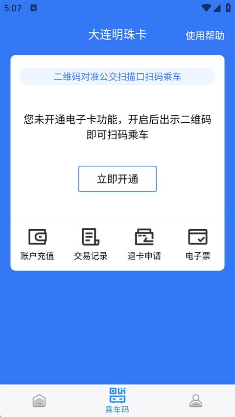 3、点击乘车码,需先开通电子卡功能,开启后出示二维码即可扫码乘坐公交地铁;