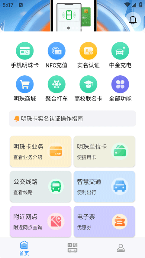 1、打开大连明珠卡APP,首页提供了NFC、充电、商城、打车 、手机明珠卡等众多生活服务;