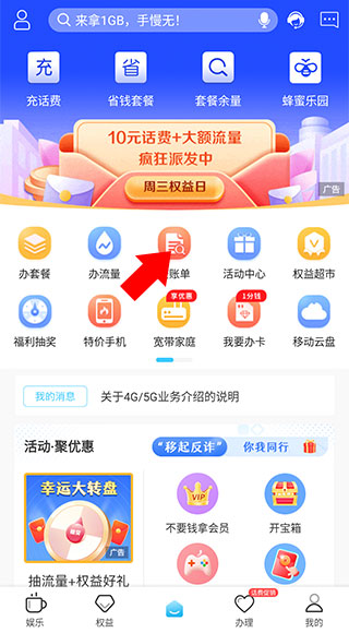 4、查询办理一键直达:业务套餐,账单积分,一站式办理。