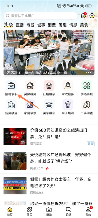 1、打开绍兴E网App,在首页可以看到有【招聘求职】点击