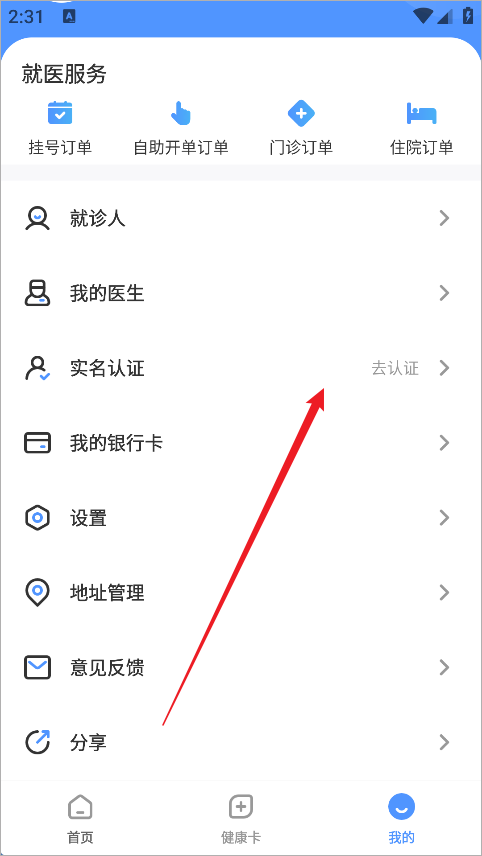 1、打开“健康内江”,在“我的”页面找到“实名认证”入口并点击进入。