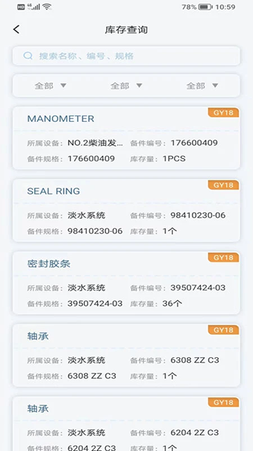库存管理旨在帮助船岸端人员实时了解船上备件、物料、油料库存情况,当低于设定的最低库存时发起提醒,或库存有效期即将过期时发起提醒;
