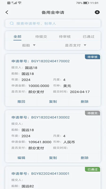 申请审批支持招待费申请、购物申请、合同、会签、程租、期租、包运以及用章申请等审批流的查看、审批功能;