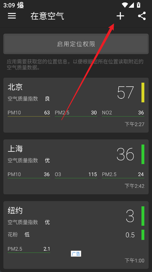 1、打开在意空气App,点击首页右上角的“+”按钮。