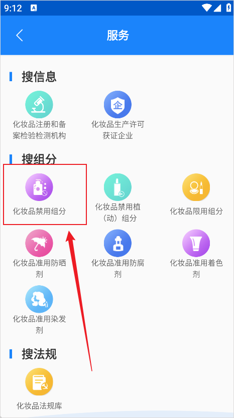 2、然后往下滑找到【搜组分】里面的【化妆品禁用组分】