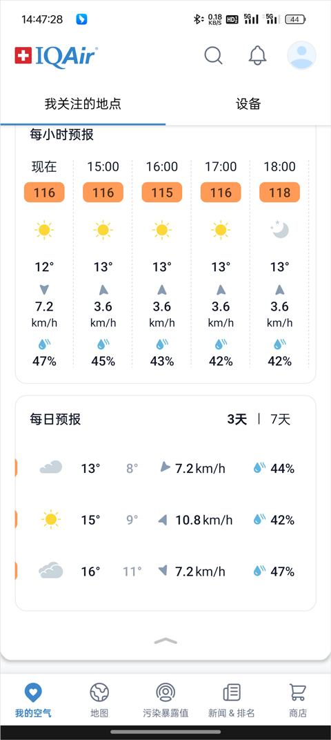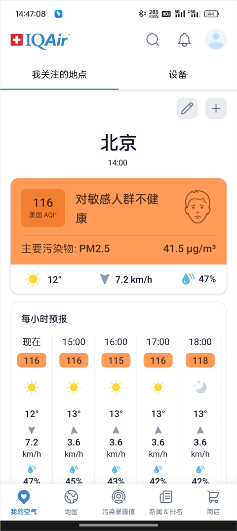 AirVisual是一款全球领先的空气质量检测软件,其以数据精准、界面简洁、更新及时而著称。用户可以实时查看全球上万个城市的空气指数,包括PM2.5、PM10、臭氧、二氧化氮等主要污染物浓度,还能通过历史曲线图了解空气变化趋势。AirVisual空气检测App不仅提供空气数据,还融合了未来几天的天气、温度、湿度、风速、风向预测等功能,让你对整体环境有更全面的认知。软件还支持个性化城市收藏,只需点击“自选”即可快速查看常驻城市的实时空气情况。