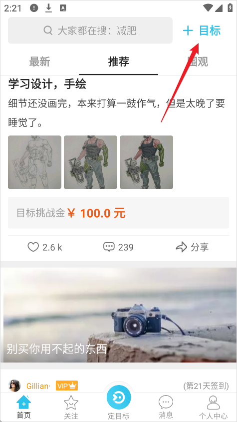 1、打开达目标App后,进入首页界面,点击右上角的“+”图标创建新目标。