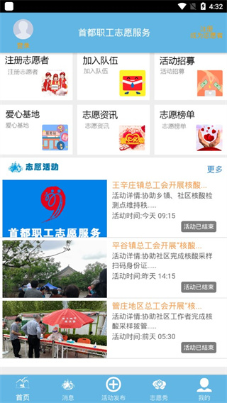 2、在首页我们可以看到志愿活动,以及志愿资讯、爱心基地等服务;