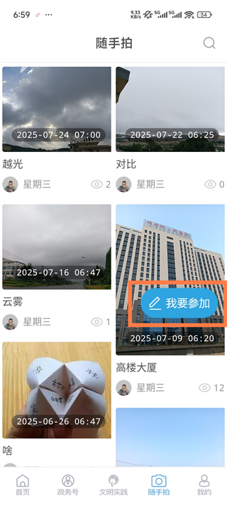 1、打开直播荣成App,点击随手拍板块