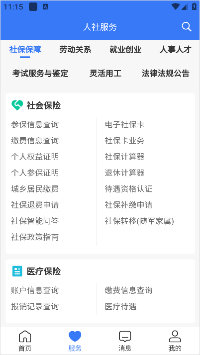 参保信息查询、医疗保险查询、退休人员查询、退休待遇发放查询 、工伤待遇查询、职业技能竞赛查询、公益性岗位查询、失业保险金申请查询、待遇资格认证查询、见习基地申请查询、公益性补贴查询、考试成绩查询等,约30多项个人服务。