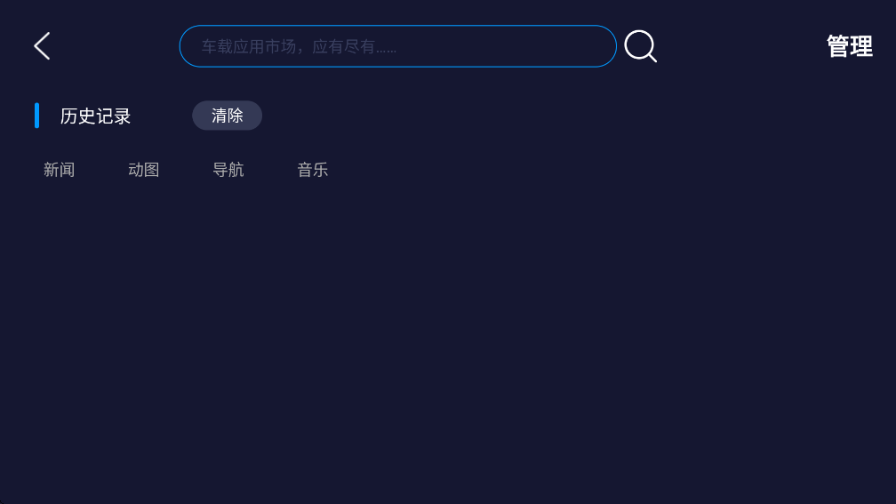 点击搜索图标进入搜索页面,可以输入字母 汉字搜索车机应用,搜索框左下方的应用推荐下载您可能需要的应用,右侧则提供搜索历史记录,清楚历史记录等,提供多种搜索方式轻松找到需要的车机应用。