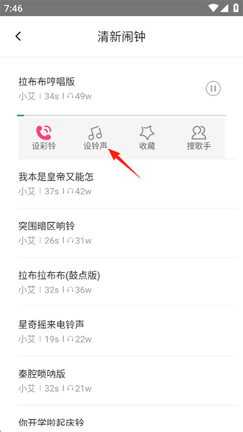 2、挑选一首你喜欢的铃声并点击它,在弹出的功能列表中选择设铃声;