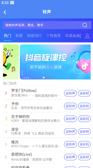 3、热门铃声一键设置